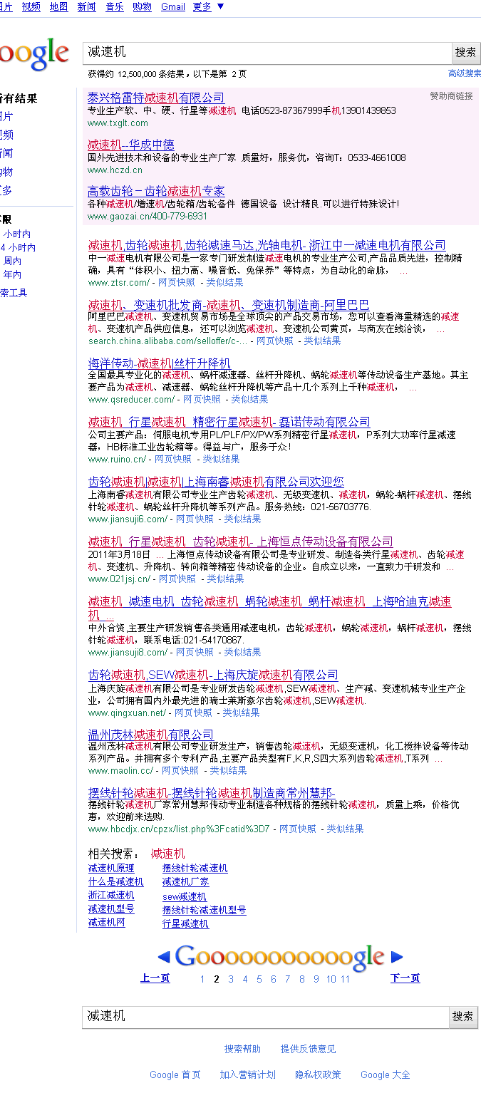 最近,公司網站排名上升瞭一些 。輸入關鍵詞“減速機”,本公司網站在谷歌的結合排名在第16位,目前位於搜索結果的第二頁中間。随著公司業務的提升,網站會有更好的排名。也謝謝各位朋友對本公司支持與幫助,謝謝。