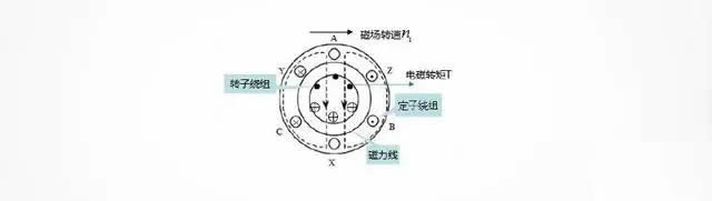由於(yú)旋轉磁場不斷切割轉子中的閉合導體,産生感應電動勢和感應電流 ,再由轉子中的感應電流和旋轉磁場的相互作用産生電磁轉矩,使得轉子随著(zhe)旋轉磁場的方向同向運轉。比如籠型異步電動機,由於(yú)旋轉磁場順時針切割轉子導體,相當於(yú)導體逆時針轉動,運用右手定則,讓磁感線垂直穿過手心,拇指指向導體的運動方向,四指的方向就是感應電流的方向(如圖4所示籠型異步電動機轉子繞組電流的方向),然後應用左手定則,磁感線穿過手心,四指指向電流運動方向,大拇指方向即爲轉子受到電磁力的方向(如圖所示電磁轉矩矩T方向),在電磁力的作用下形成電磁轉矩,拖動轉子順著(zhe)旋轉磁場的方向轉動。