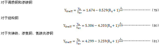 相對齒根表面狀況系數YδrelT可按粗糙度和材料從圖9查得,圖中曲線是用試件做試驗得到的;也可用式(76)~式(81)計算。