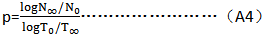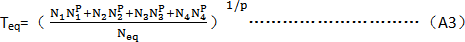 圖A1是以對數坐标的某齒輪的承載能力曲線與其整個工作壽命的載荷圖譜,圖中T1、T2、T3、……爲經整理後的實測的各級載荷,N1、N2、N3、……爲與T1、T2、T3、……相對應的應力循環次數。小於名義載荷T的50%的載荷(如圖中T5),認爲對齒輪的疲勞損傷不起作用,故略去不計,則當量應力循環次數Neq