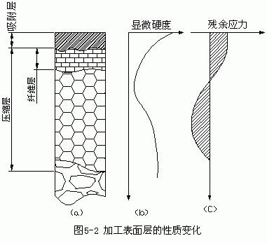 表面層的物理力學性能包括表面層的加工硬化、殘餘應力和表面層的金相組織變化。機械零件在加工中由於受切削力和熱的綜合作用 ,表面層金屬的物理力學性能相對於基本金屬的物理力學性能發生瞭(le)變化。圖 5— 2a所示爲零件表面層沿深度方向的變化。最外層生成有氧化膜或其他化合物,並(bìng)吸收、滲進氣體粒子,稱爲吸附層。吸附層下是壓縮層,它是由於切削力的作用造成的塑性變形區,其上部是由於刀具的擠壓摩擦而産生的纖維層。切削熱的作用也會使工件表面層材料産生相變及晶粒大小變化。