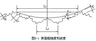 加工表面的微觀幾何特征主要包括表面粗糙度和表面波度兩部分組成 ,如圖 5— 1所示。表面粗糙度是波距 L小於(yú) 1mm的表面微小波紋;表面波度是指波距 L在 1~ 20mm之間的表面波紋。通常情況下,當(dāng) L/H(波距 /波高)﹤ 50時爲表面粗糙度, L/H=50~ 1000時爲表面波度。