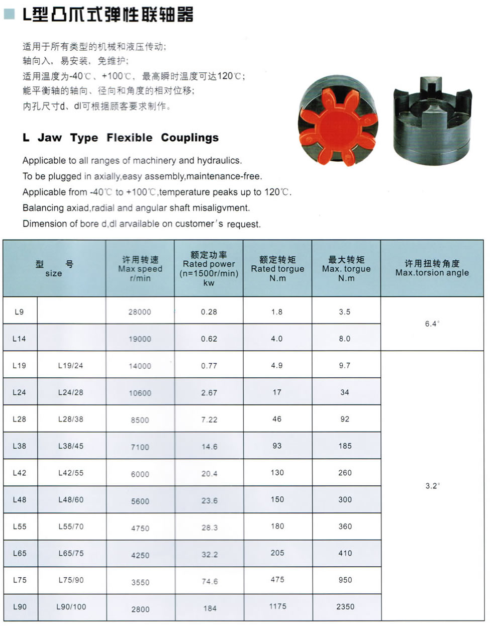 L型凸爪式彈性聯軸器适用於所有類型的機械和液壓傳動;軸向入,易安裝,免維 護;适用溫度爲-40度,+100度,最高瞬時溫度可達120度; 能平衡軸的軸向,徑向和角度的相對位移;内孔尺寸d,d1可 根據顧客要求制作。
