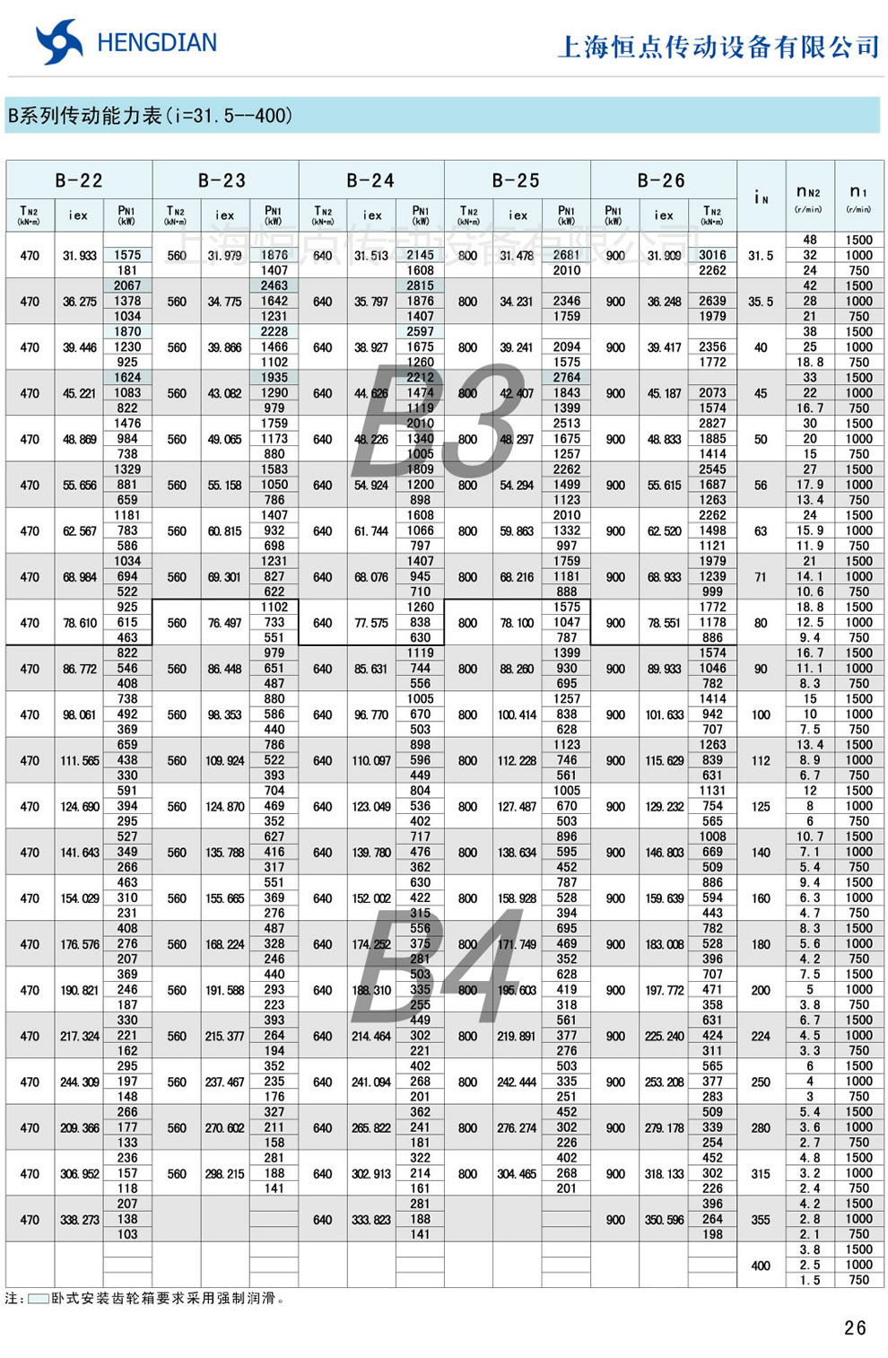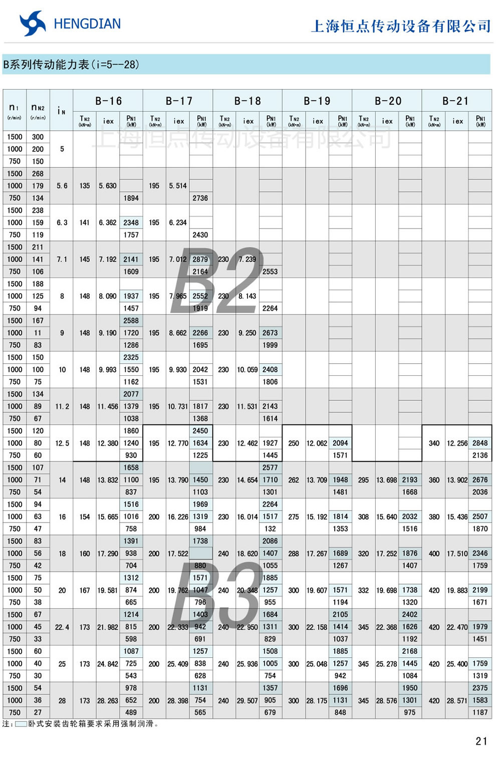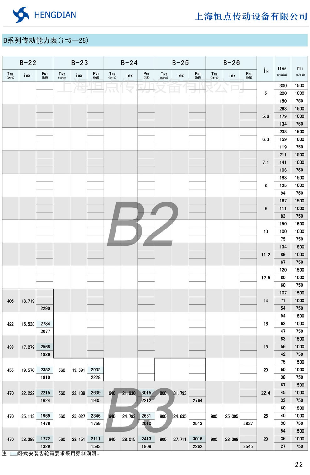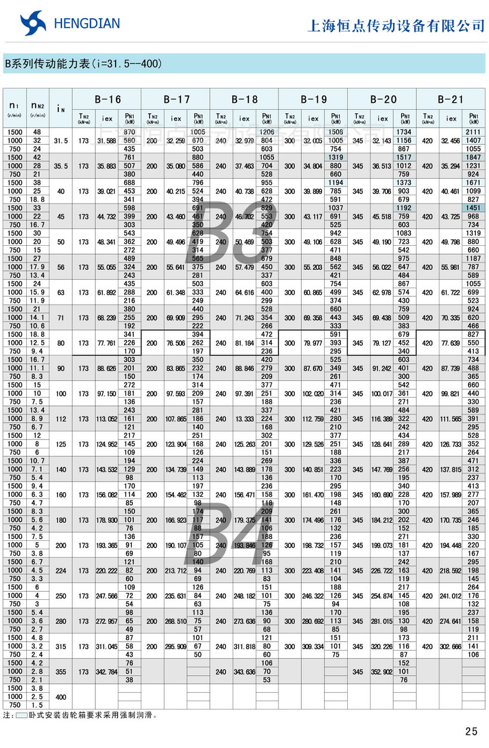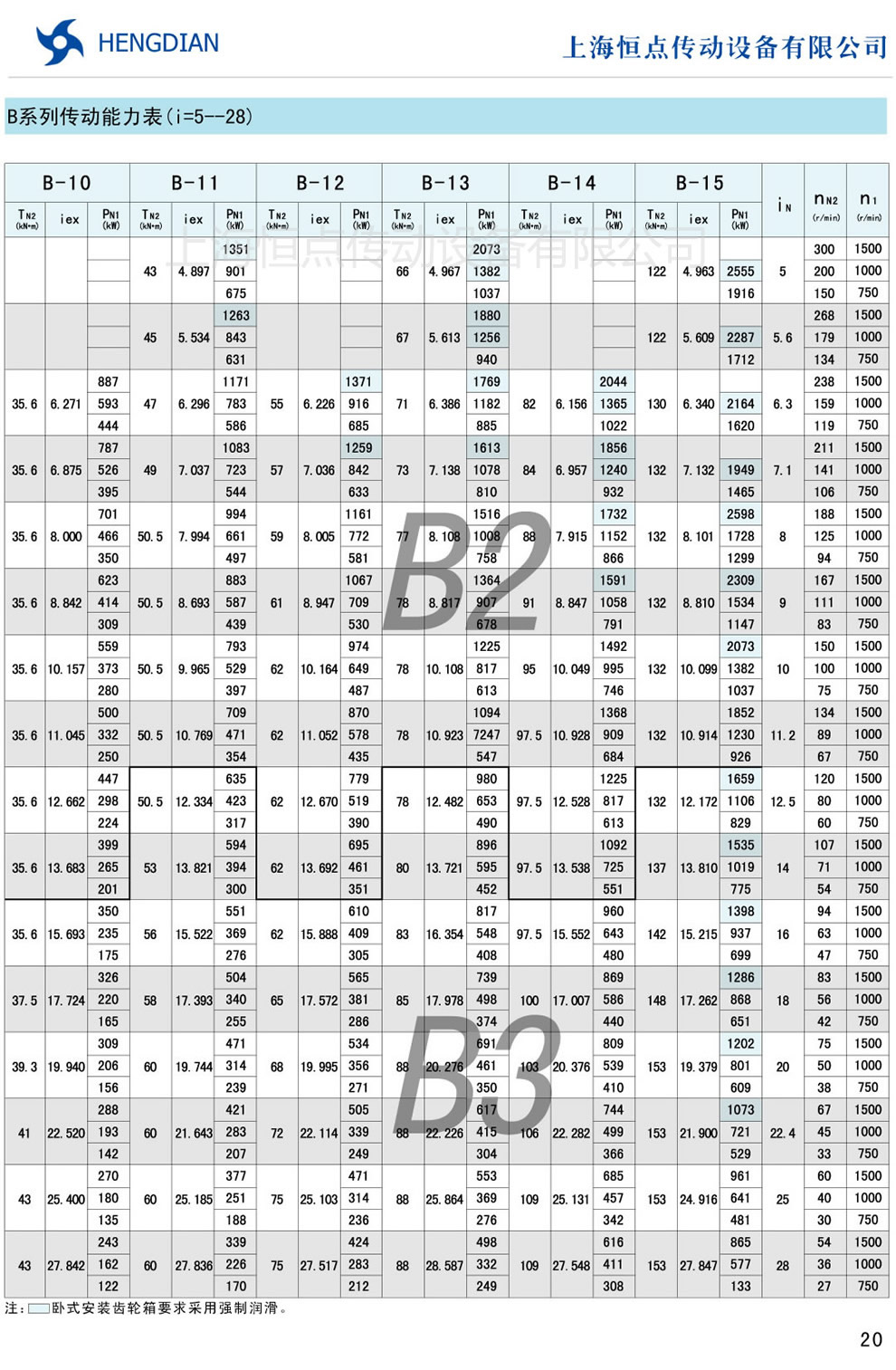 B系列傳動能力表 - HB标準工業齒輪箱