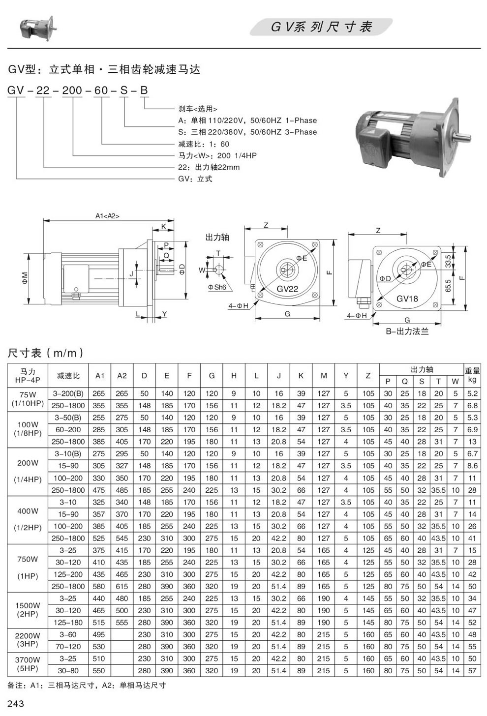 GV立式齒輪減速電機的型号表示方式,GV立式小齒輪減速機馬達的外形尺寸表,具體型号: GV18,GV22,GV28,GV32,GV40,GV50; 可配電機功率: 75W(1/10HP),100W(1/8HP),200W(1/4HP),400W(1/2HP),750W(1HP),1500W(2HP),2200W(3HP),3700W(5HP)