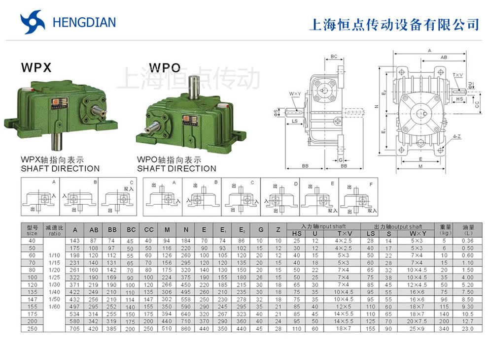 安裝尺寸及外形尺寸,WPO與WPX減速機軸輸入,軸輸出.WPO與WPX系列減速機軸指向表示方法.機座号從40到250,可選速比從10到60.WPO與WPX系列蝸輪蝸杆減速機選型指南