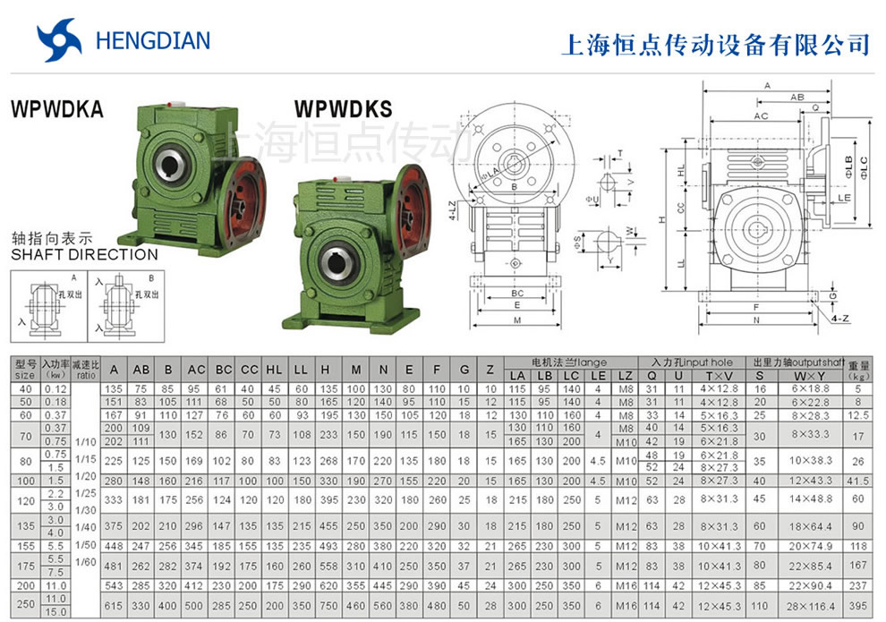 WPWDKA與WPWDKS系列萬能型蝸輪蝸杆減速機選型指南,WPWDKA與WPWDKS型減速機軸指向表示方法.機座号40到250,速比10到60.WPWDKA與WPWDKS減速機的外形尺寸及安裝尺寸